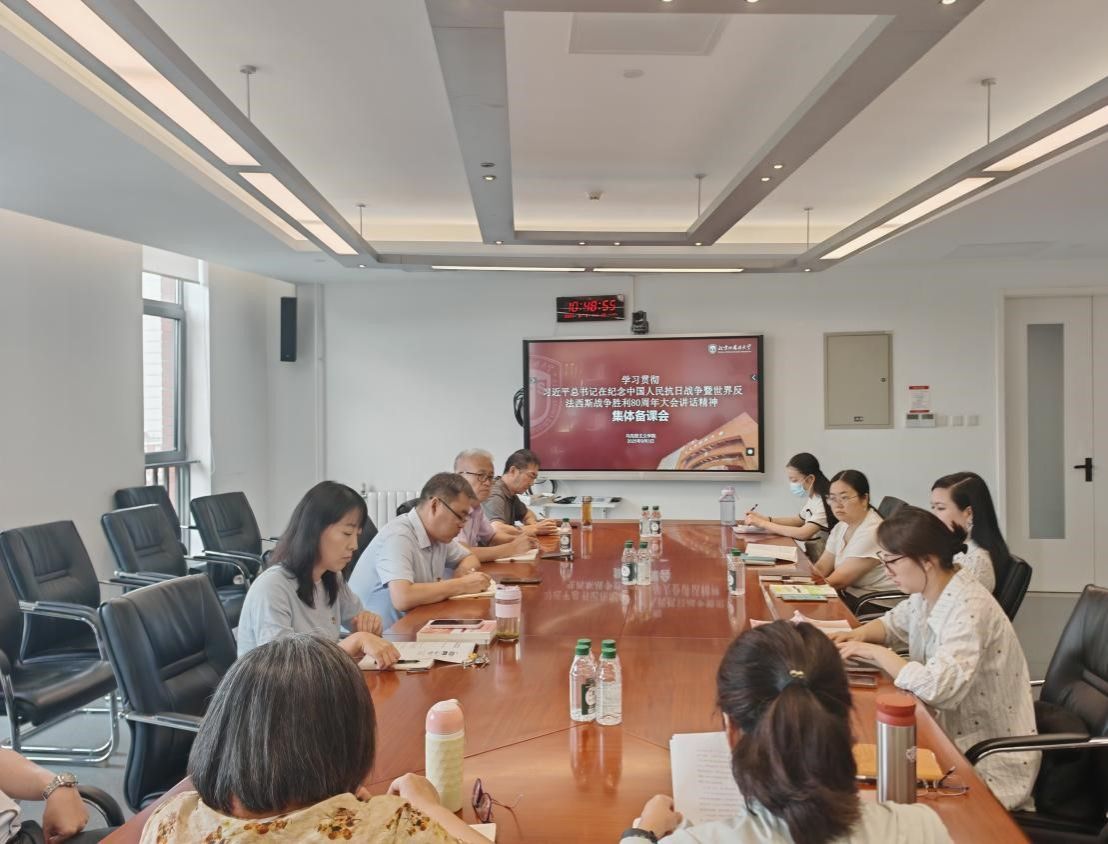 9月3日,beat365正版唯一官网在国内大厦608会议室集体收看纪念中国人民抗日战争暨世界反法西斯战争胜利80周年纪念大会盛况,并围绕学习贯彻纪念大会精神开展集体备课。全体思政课教师参加了备课会。会议由副院长王曼倩主持。