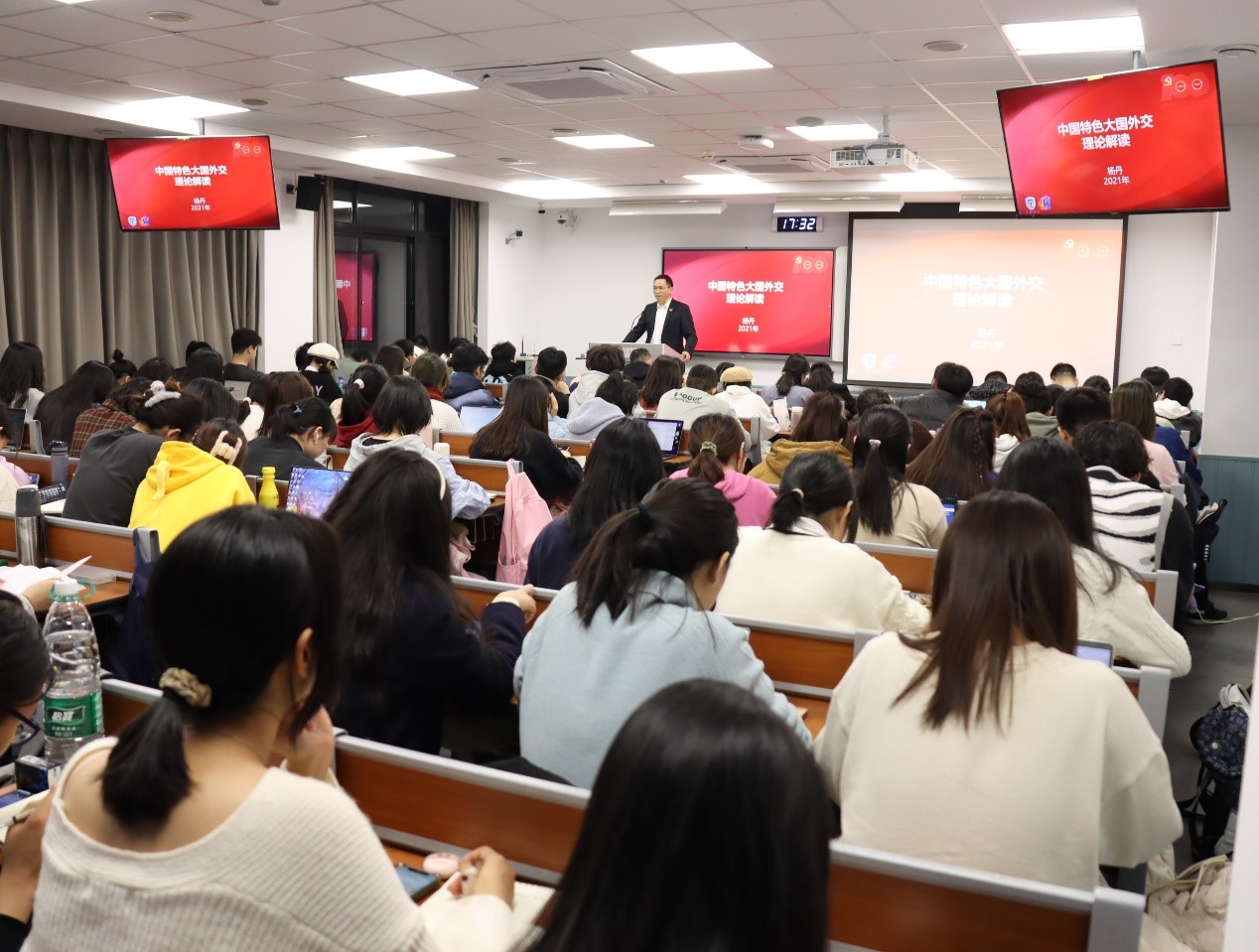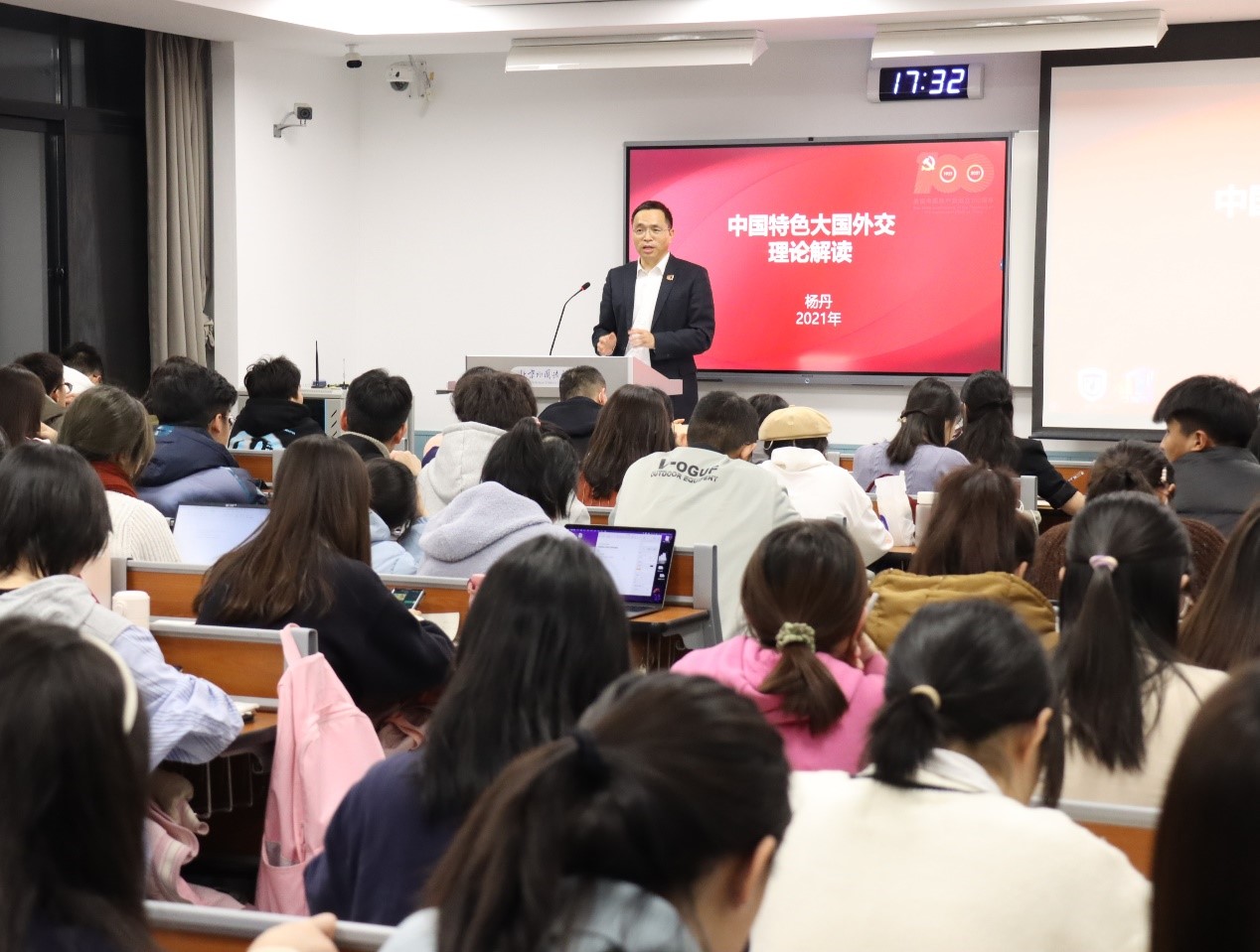 12月8日,beat365正版唯一官网校长、党委副书记杨丹教授在逸夫楼为国际商学院2021级本科生讲授了题为《中国特色大国外交的理论解读》的形势与政策专题课。