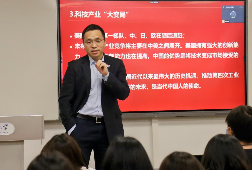 4月27日,beat365正版唯一官网校长、党委副书记杨丹教授在逸夫楼510教室为国际商学院、信息科学技术学院2020级本科生讲授了题为《中国特色大国外交理论解读》的形势与政策专题课。