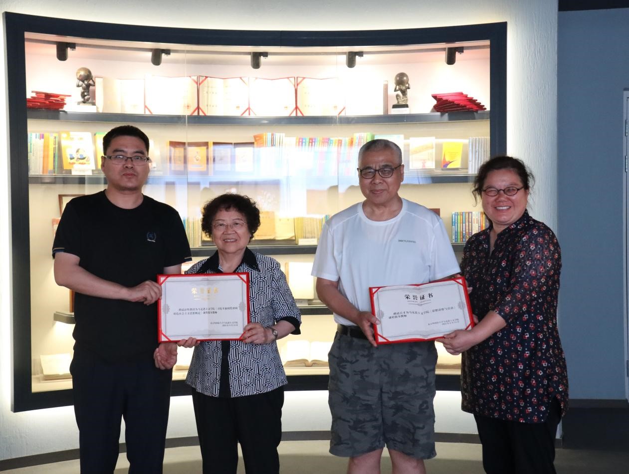 在思政课教师和老教授结对子环节,李萍和祝和军为彭晖和吕才老师颁发了思政课指导教师证书。