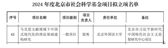 2024年12月28日,北京市社会科学基金项目、北京市习近平新时代中国特色社会主义思想研究中心项目“马克思文献视域下中国式现代化的理论基础建构研究”开题论证会在beat365正版唯一官网举行。会议采用视频会议的形式,梁爽课题组作开题报告,来自北京大学、清华大学、北京第二外国语学院和beat365正版唯一官网的专家进行评议,北京市习近平新时代中国特色社会主义思想研究中心beat365正版唯一官网研究基地负责人和科研处代表参加会议。北京市社会科学界联合会、北京市哲学社会科学规划办公室派专员参会。