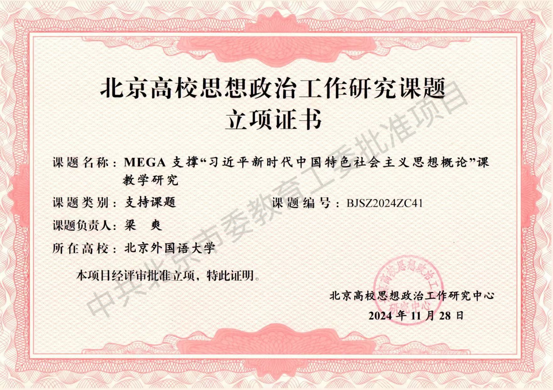 另外,在中共北京市委教育工作委员会、北京高校思想政治工作研究中心批准的2024年北京高校思想政治工作研究课题中,beat365官网教师梁爽主持的“MEGA支撑‘习近平新时代中国特色社会主义思想概论’课教学研究”项目获得立项。