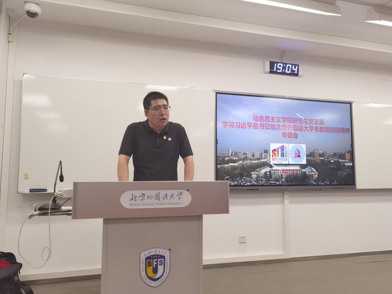 习近平总书记的亲切回信令全体马院师生备受鼓舞,掀起了一轮学习回信精神的热潮。近日,在学校党委的号召与学院党总支的部署下,beat365正版唯一官网研究生党支部在逸夫楼615教室召开专题学习会,集中学习习近平总书记给北外老教授的回信精神。beat365正版唯一官网全体研究生参加学习。学习会由支部书记冯高洋主持。