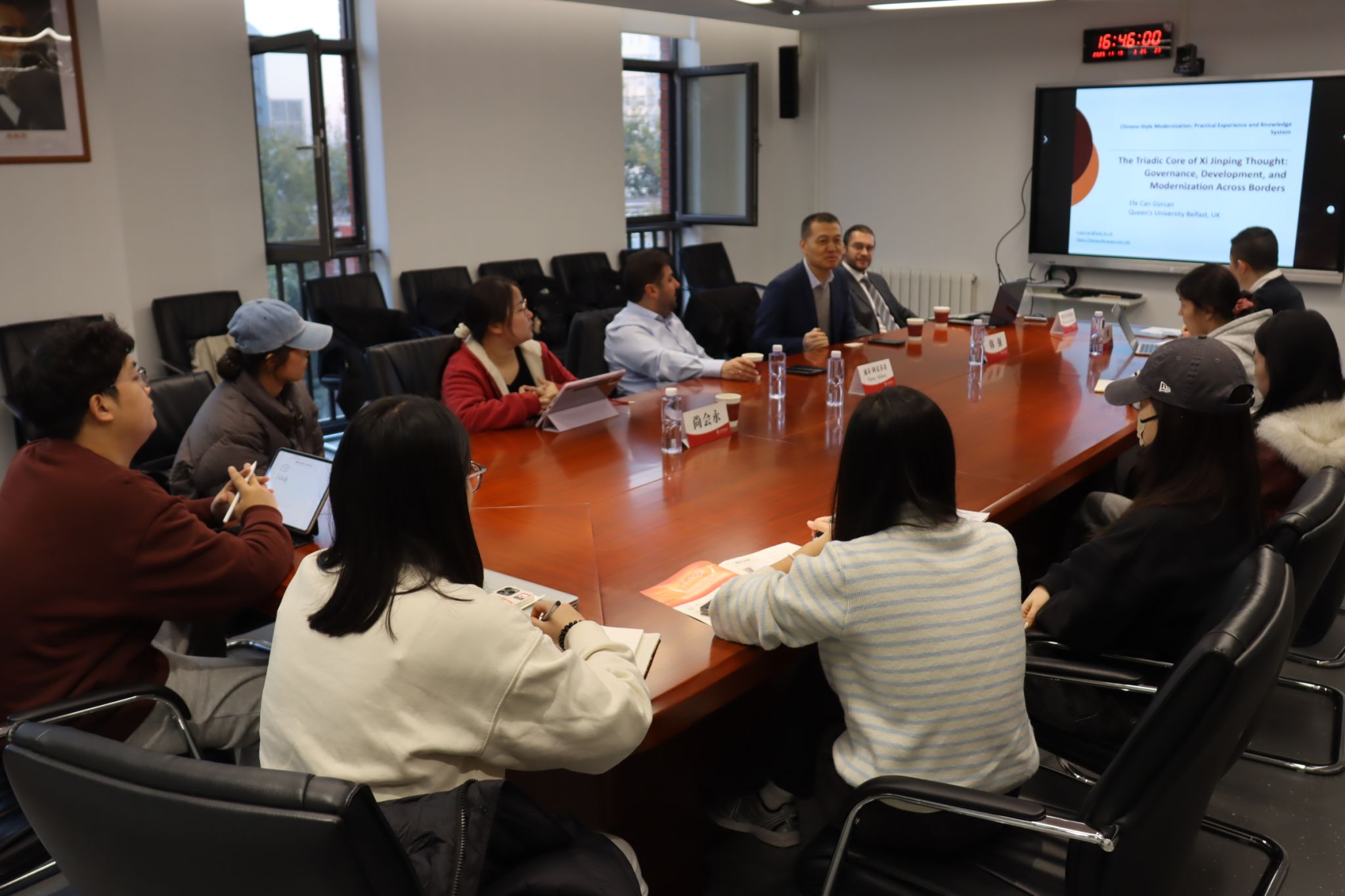 在讨论交流环节,强教授同居尔詹博士、阿克乔奇先生深入交流了习近平新时代中国特色社会主义思想的系统性学理阐释和海外传播路径,在场的研究生就西方学界研究习近平新时代中国特色社会主义思想的基本态势、欧洲民众对中国崛起的认识等问题进行了广泛讨论。