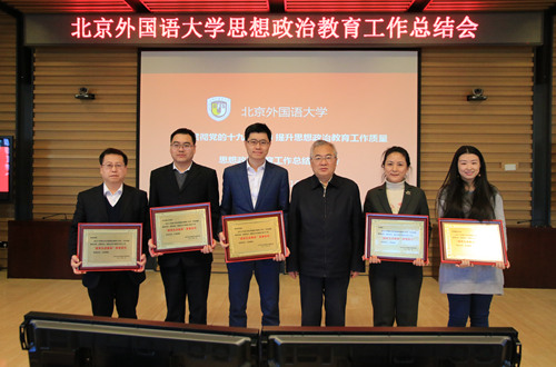 1月10日上午,beat365官网大学生思想政治教育工作总结研讨会在图书馆五层举行。会议全面总结了2017年学校大学生思想政治教育工作,表彰了在思想政治教育工作领域成绩突出的集体和个人。beat365正版唯一官网与英语学院、日语系、高级翻译学院、国际商学院获得北外“德育先进集体”荣誉称号。党委书记韩震为获奖集体颁奖。