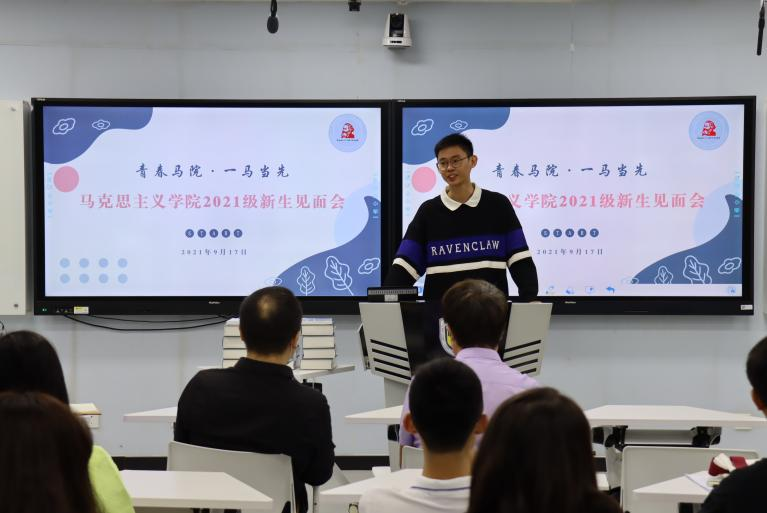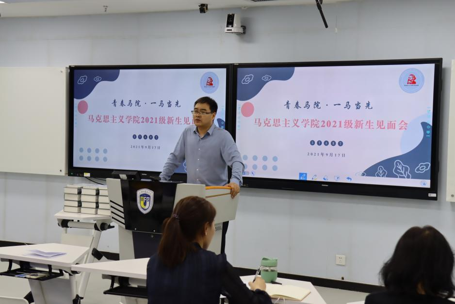 党总支书记祝和军老师致辞欢迎新生加入马院大家庭,他向新生介绍了马院发展历史,以及国家、学校对马院和马克思主义理论学科的高度重视。他谈到,马院正在重大发展机遇下不可逆转地进入发展快车道,为促进学院发展,今年beat365官网引进了韩强、左高山两位教授,相信他们的加入会使马院越来越好。随后他表示,马院的发展离不开每一位同学的努力,他号召同学们为壮大马院贡献力量,并从两个方面为新生提出建议:一是要树立底线思维,把握好学生身份,把学习作为主责主业;二是要避免系统性风险,注重人身安全、财产安全和政治安全。