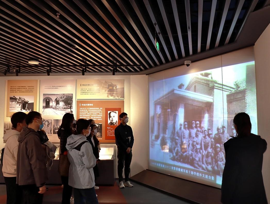 校史馆展厅共分为四个部分和两个专题。先进的博物馆展陈理念与学校80年的发展历程紧密结合,全面展现了学校生于民族救亡的烽火,成于新中国创业的磨砺,兴于改革开放的春天,盛于伟大复兴的新时代这一波澜壮阔的历史画卷,摹写出学校与国家、民族同命运,与党的事业共呼吸的精神特质。讲解员沿着学校发展的时间脉络,讲述馆内的历史档案、历史物件背后的故事。同学们驻足赞叹,沉浸于北外与国家命运休戚与共的历史进程中。