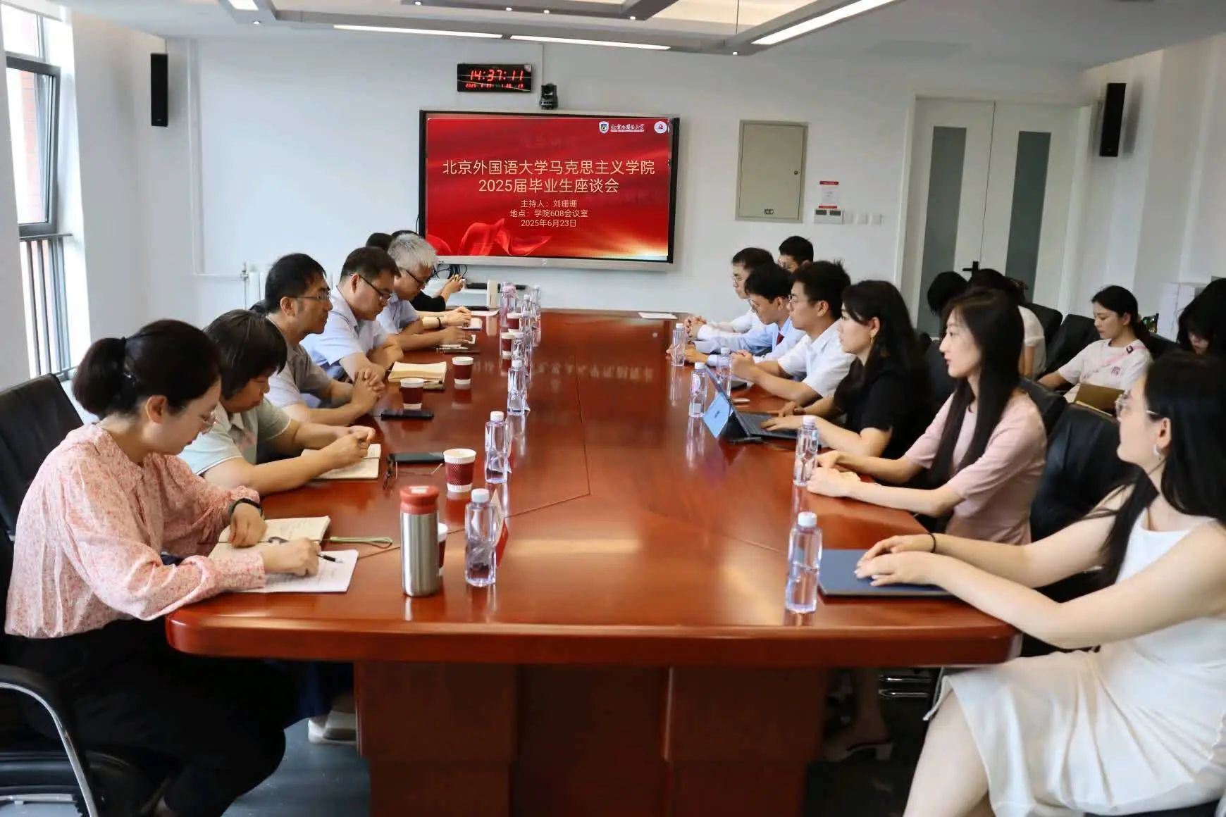6月23日,beat365正版唯一官网2025届毕业生座谈会在国内大厦608会议室召开。学院党总支书记祝和军、副院长孙磊、党总支组织员王浩、辅导员刘珊珊及导师代表陈文力、韩雪青、赫雪等参加座谈会,与2025届全体毕业生面对面交流,共话成长与未来。本次座谈会由刘珊珊主持。