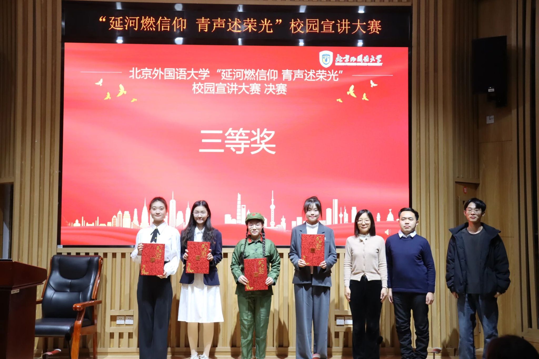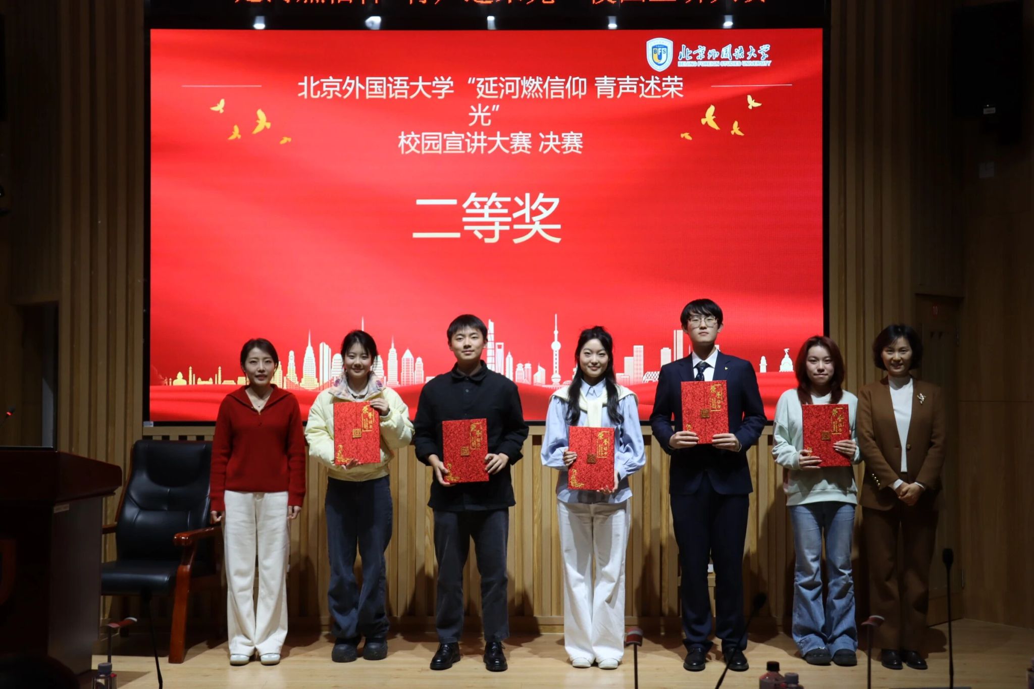 决赛现场,26组选手围绕大赛主题,将北外红色校史与个人成长感悟深度结合,以鲜活表达诠释青年担当,让红色基因在宣讲中赓续传承。